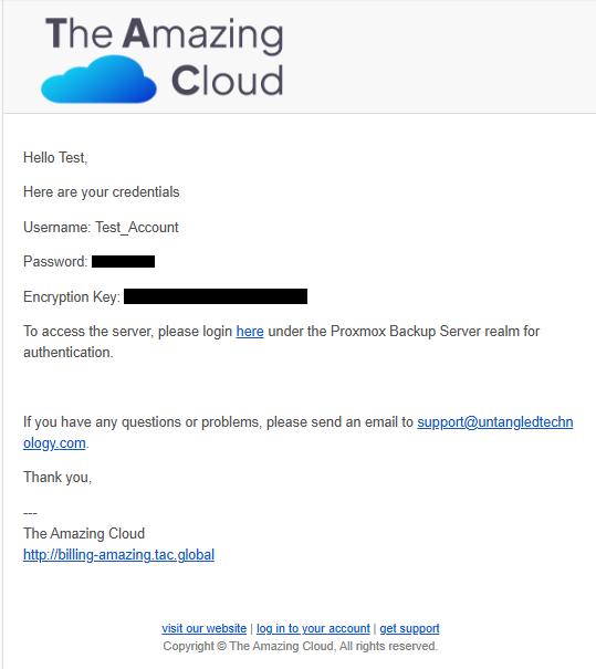 You should have received an email with your login credentials, your client encryption key and the server link. Please make sure to save the encryption key on your server.